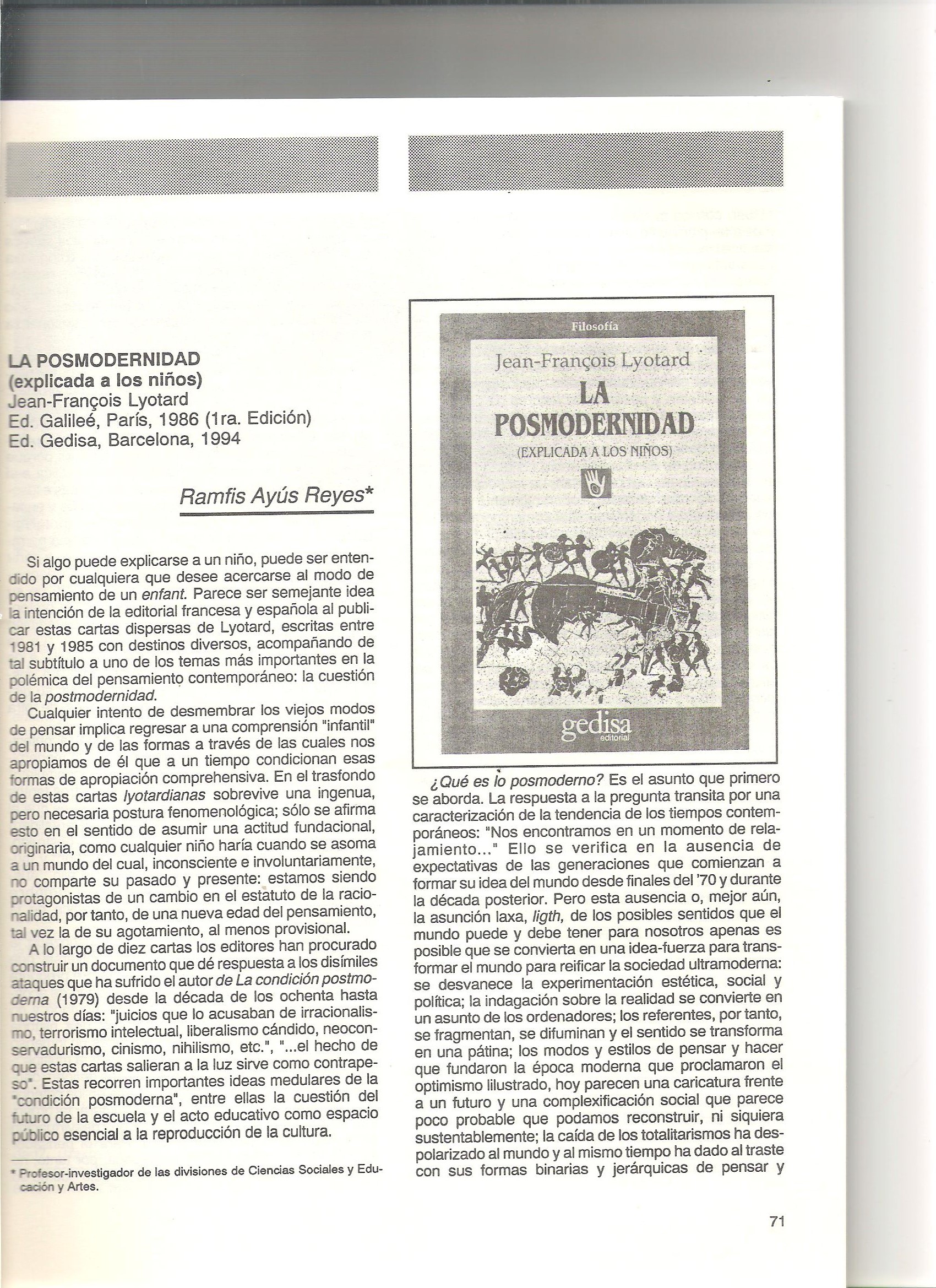 Si algo puede explicarse a un niño, puede ser entendido por cualquiera que desee acercarse al modo de pensamiento de un enfant. Parece ser semejante idea la intención editorial francesa y española al publicar estas cartas dispersas de Lyotard, escritas entre 1981 y 1985 con destinos diversos, acompañando de tal subtitulo a uno de los temas más importantes en la polémica del pensamiento contemporáneo: la cuestión de la postmodernidad Para obtener el artículo completo pueden contactar al Editor de la Revista Perspectivas docentes en el siguiente correo electrónico perspectivas.dese@ujat.mx.