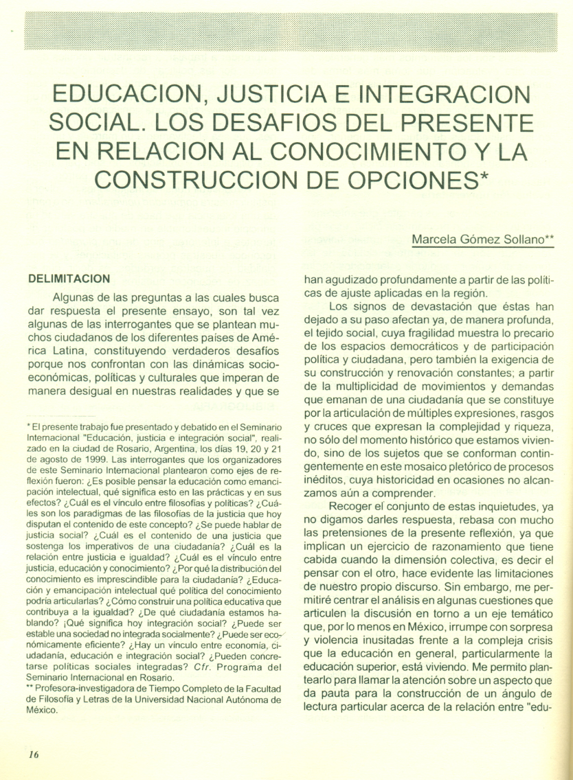 Educación, justicia e integración social. Los desafíos del presente en relación al conocimiento y la construcción de opciones